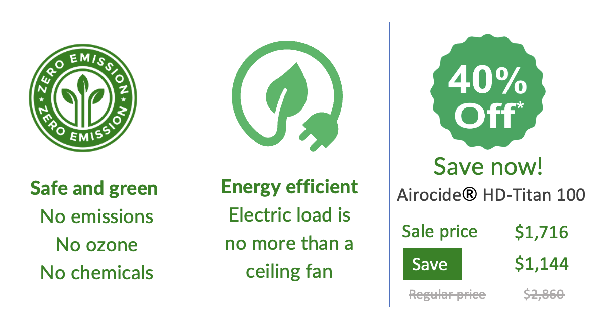 *40% Off sale is applicable to Airocide® HD-Titan 100. Offer is limited to two units per Customer Account. Only United States-based customer accounts are eligible. While supplies last. To be eligible, Quote Forms or product consultation requests must be received by Sterilumen™, Inc. between Monday, January 2, 2023, 7am EDT and Friday January 27, 2023, 11pm EDT. To be eligible for the 40% discount, orders for Airocide® HD-Titan 100 must be submitted by February 28, 2023, 11pm EDT. The purchaser is responsible for all shipping charges and taxes. Cannot be combined with any other offers or applied to past purchases. Terms and conditions apply.
