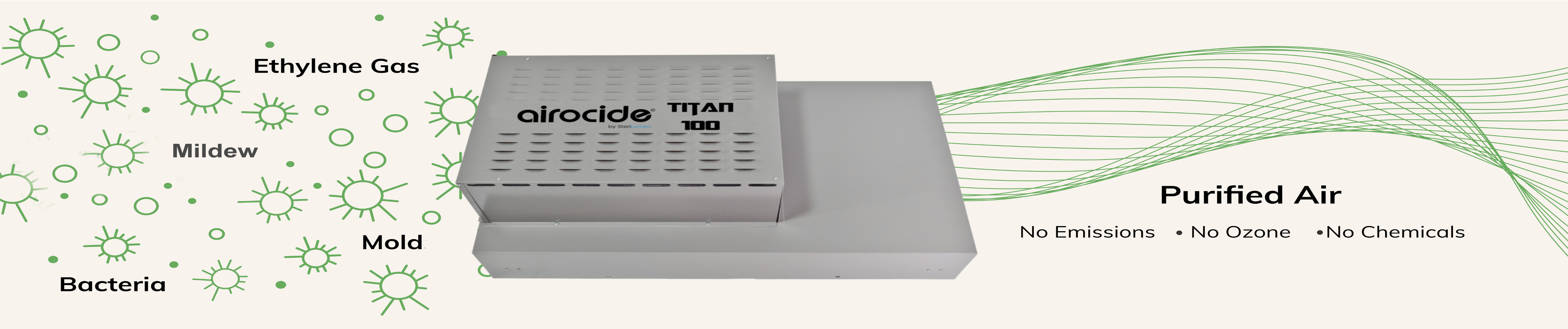 Airocide®HD-Titan 100 uses patented Photocatalytic Conversion technology to effectively remove airborne mildew, mold, ethylene gas, bacteria, and other contaminants.